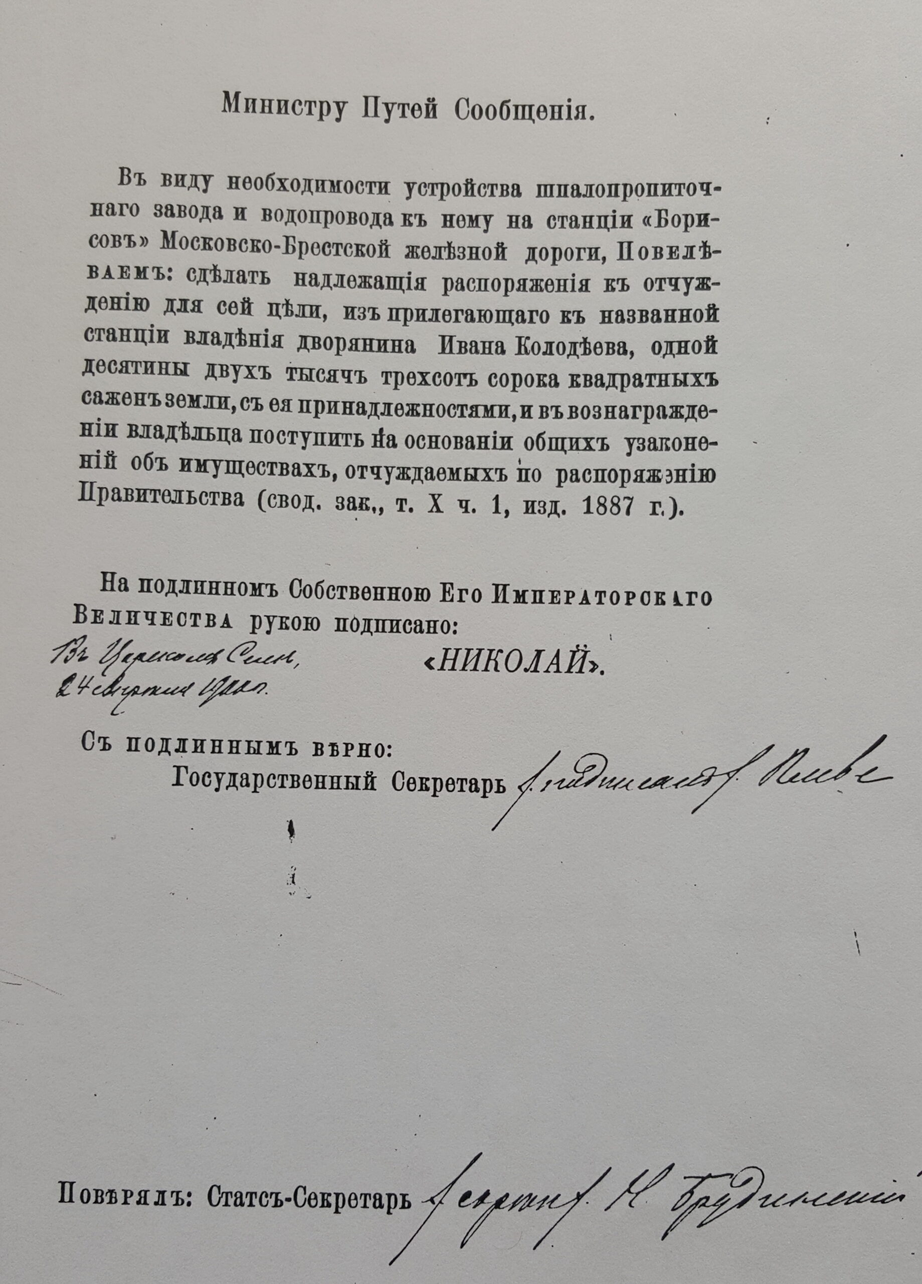 Для устройства шпалопропиточного завода и водопровода к нему на станции Борисов Московско-Брестской железной дороги оказалось необходимым занять землю с ее принадлежностями в количестве четырех тысяч семисот сорока квадратных сажень, из владения дворянина Ивана Колодеева, прилегающую к станционной территории.